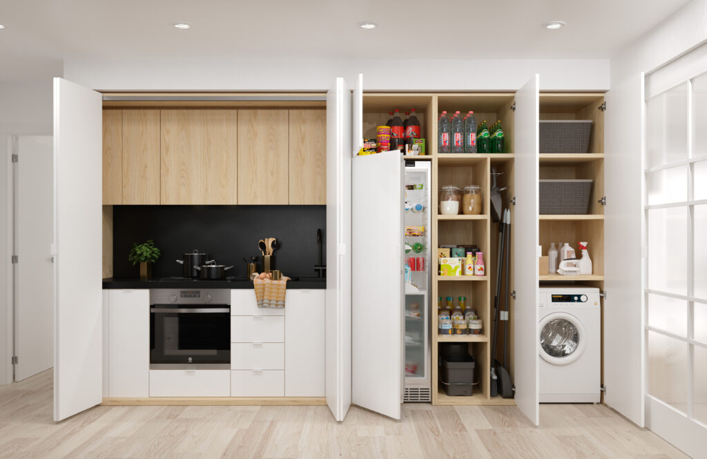 En este tipo de planteamientos, el armario Kitchen de Tegar permite concentrar en un único módulo todas las funciones básicas de una cocina. Sus puertas plegables facilitan un acceso total al interior cuando está en uso y, al cerrarse, el conjunto queda totalmente camuflado, lo que ayuda a mantener el espacio ordenado cuando no se está utilizando.
