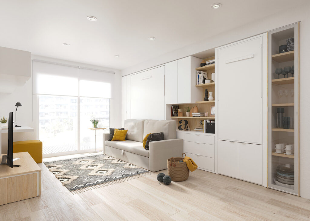 El sistema se completa con otras soluciones transformables que ayudan a liberar espacio en la vivienda. Entre ellas destacan sofás tras los que aparece una cama abatible, espacios de home office que se convierten en mesa cuando se necesitan o módulos de cocina y lavandería que quedan completamente camuflados cuando no están en uso.